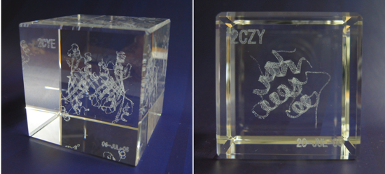 ガラスに彫刻した立体構造を見て、タンパク質の構造の理解をより深められます。写真などの彫刻も可能です。